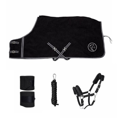 The Equip’horse Winter Pack is a must-have set designed to keep your horse warm and well-protected throughout the cold winter months. The fleece blanket, available in black, blue, or red, is made from breathable, lightweight, and incredibly soft material, providing optimal protection from the cold while ensuring your horse’s comfort. The sturdy braided lead rope ensures easy handling during walks or stable movements, and the padded halter with synthetic sheepskin prevents chafing and irritation on your horse’s sensitive skin. Additionally, the protective leg wraps included in this pack help to safeguard your horse’s tendons and joints during daily activities. Perfect for all horse breeds, whether in the field or in the stable, this winter pack offers a complete and practical solution to combat winter’s harsh conditions.